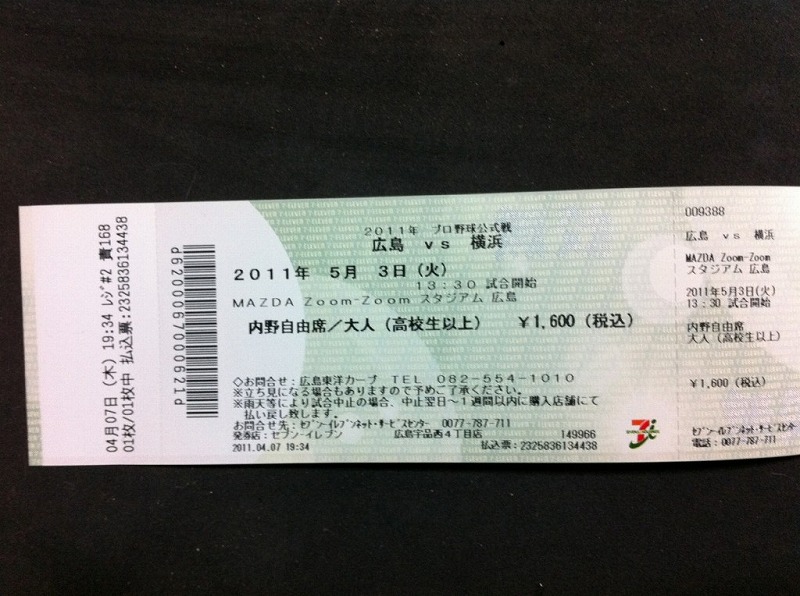 昨日、やっとカープが1勝してくれました。 ところで、5月3日(火)の横浜戦を観に行くため、 チケットをコンビニで買いました。